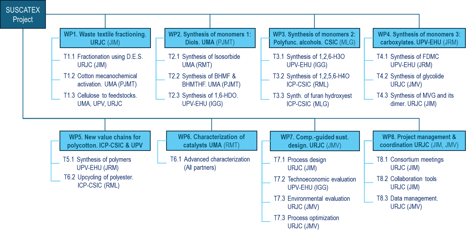 The main objective of SUSCATEX is to design and optimize chemo-catalytic pathways to convert cotton textile waste into valuable chemicals for the synthesis of polymers and other sustainable materials. This goal will be achieved through a structured work plan divided into interconnected phases.